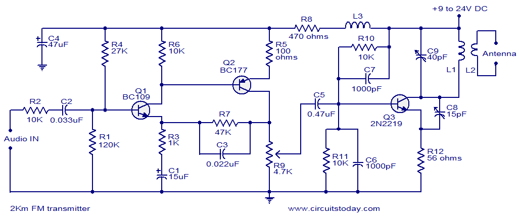 With a matching antenna, the FM transmitter circuit shown here can transmit signals up to 2 kilometers. The transistor Q1 and Q2 forms a classic high sensitive preamplifier stage. The audio signal to be transmitted is coupled to the base of Q1 through capacitor C2. R1, R3, R4, R6, R5 and R9 are the biasing resistors for the preamplifier stage comprising of Q1 and Q2. Transistor Q3 performs the collective job of oscillator, mixer and final power amplifier. C9 and L1 forms the tank circuit which is essential for creating oscillations. Inductor L2 couples the FM signal to the antenna.