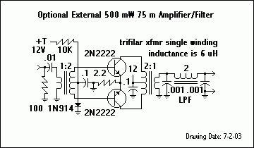 Both receive and transmit band pass filtering are done by the same half-pi BPF. The diode pair in the mic circuit reduce the "chirp" that occurs during the R/T transition. Additional BS170s could easily be used to mute both the mic and audio instead of the R/T switch directly. These BS170s would be controlled by the +R and +T voltages on their gates while their drains would be tied to 1) the mic circuit between the two coupling capacitors and 2) pin number 1 (audio in) of the LM386 (BS170 sources to ground). Additional power output (perhaps 60 mW) could also be attained by connecting the RF output transistor's collector choke (10 uH) to a 9 V supply instead of the 5 V. Additional biasing current might also be required for this change.