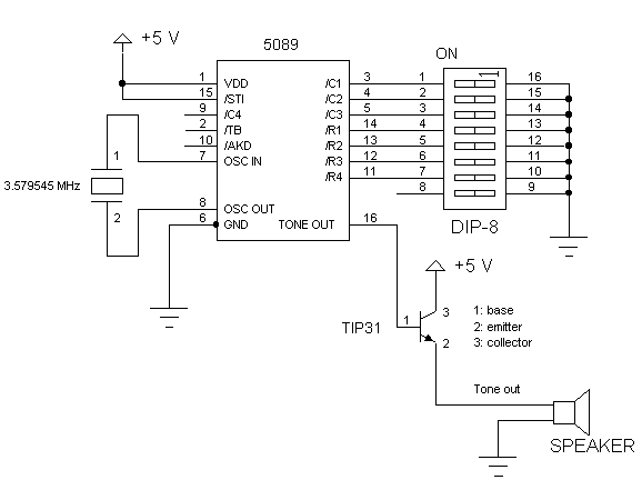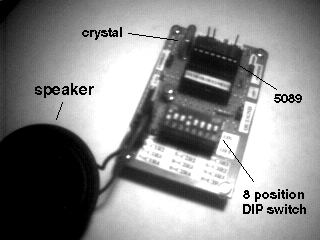 The tone generator (top) uses the 5589 chip and a DIP switch. You can actually hear the tones through the speaker. The bottom circuit uses the 8870 to decode a tone and display its associated number on the 7-segment LED.