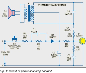 Here is a mains-operated doorbell that produces parrot-like sweet voice without requiring any musical IC. The circuit is cheap and easy to construct. The AC mains is fed to the circuit without using any step-down transformer.