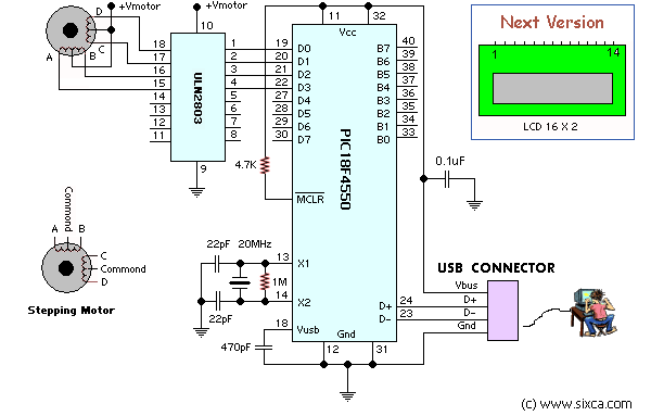 - CPU PIC18F4550 with full speed USB interface at 48MHz.